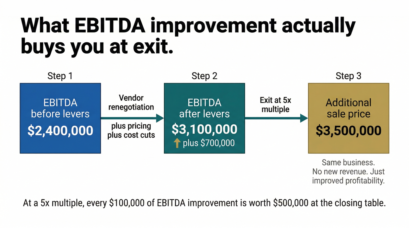A family-owned manufacturer with $18M in revenue and $2.4M in EBITDA used exactly this playbook. Vendor renegotiations improved gross margin. Operational waste was cut. Underpriced SKUs were repriced. The sales focus shifted toward higher-margin and recurring revenue. EBITDA grew 30% over 24 to 30 months, from $2.4M to $3.1M. At the eventual 5x exit multiple, that $700K in EBITDA improvement was worth $3.5M in additional sale price. That’s not revenue growth. That’s financial engineering on the existing business.