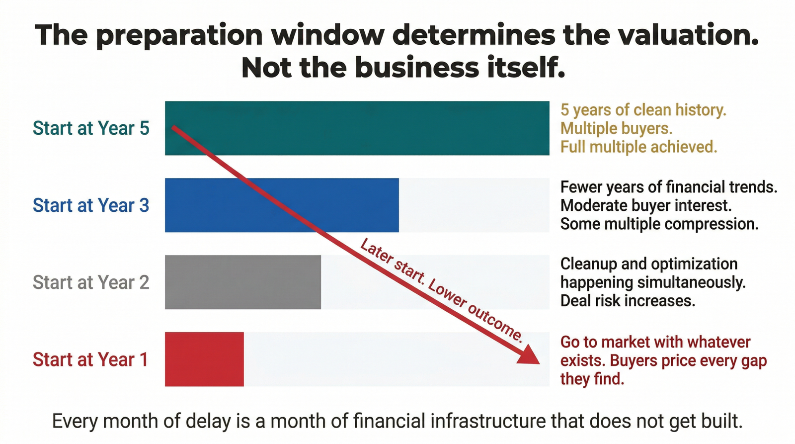 Starting at Year 3 instead of Year 5 means your books might be clean but you’ll have fewer years of consistent financial history to show. That limits what a buyer can trend. Starting at Year 2 means you’re doing financial cleanup and EBITDA optimization simultaneously, which creates strain on the business and risks the very revenue decline that tanks valuations during the sale process. Starting at Year 1 means you’re going to market with whatever you have, and whatever you have is what buyers will pay for.